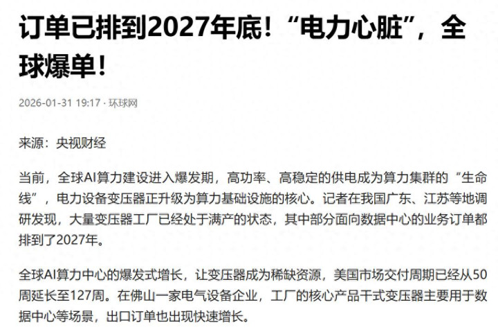 据央视财经报道,变压器正升级为算力基础设施的核心,大量变压器工厂满产,面向数据中信的订单甚至都排到了2027年。
